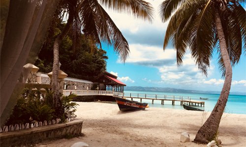 • Aerial view of a beach with colorful umbrellas and lush palm trees, creating a tropical paradise.